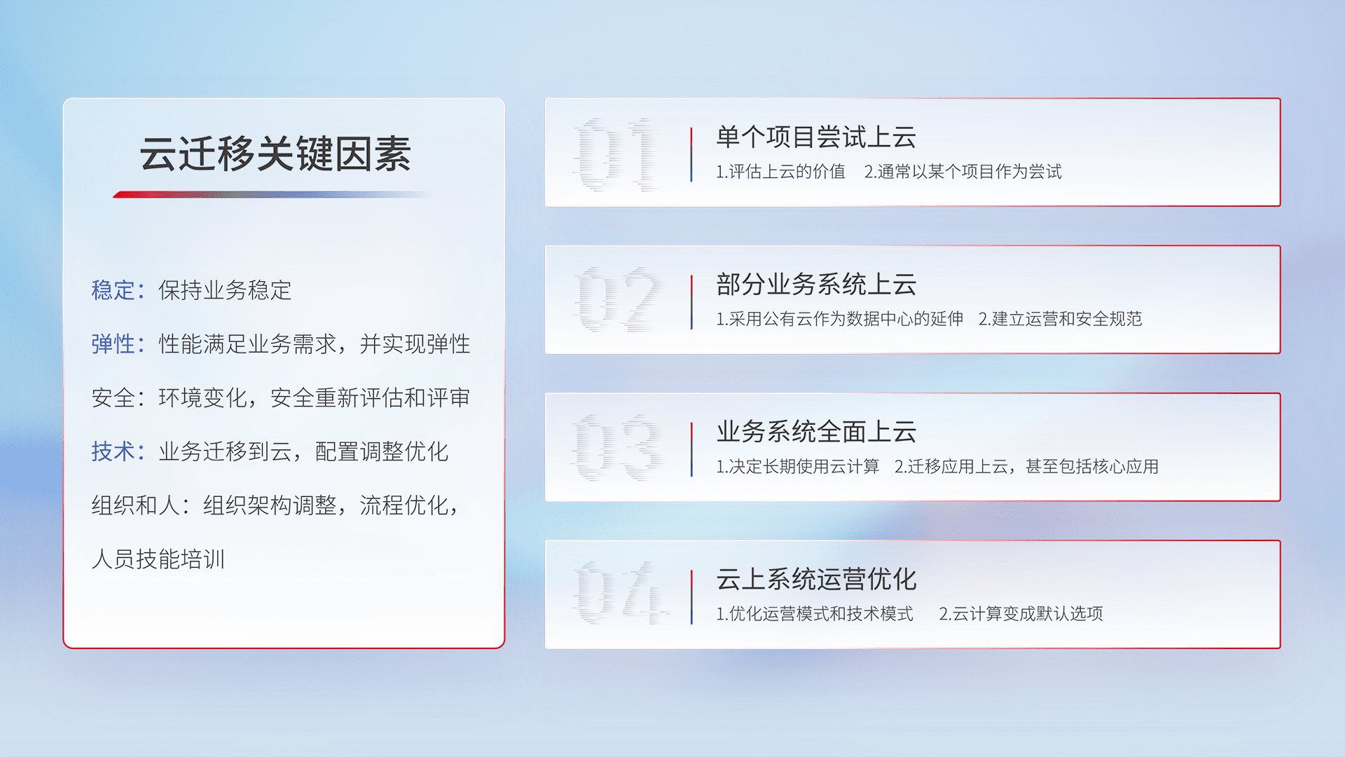 结合实际业务,,,从规划设计、、云平台选型、、、云原生改造、、数据迁移、、、集成交付,,,,迁移全过程为客户识别最佳上云路径,,,做好风险识别管理,,设计网络架构、、、、身份权限、、安全审计合规、、、操作审计、、日志审计、、监控告警策略、、、、多站点容灾设计等,,,对云上基础设施进行整体规划,,,,提升IT治理水平,,以满足弹性、、、高可用、、、、高性能的需求。。