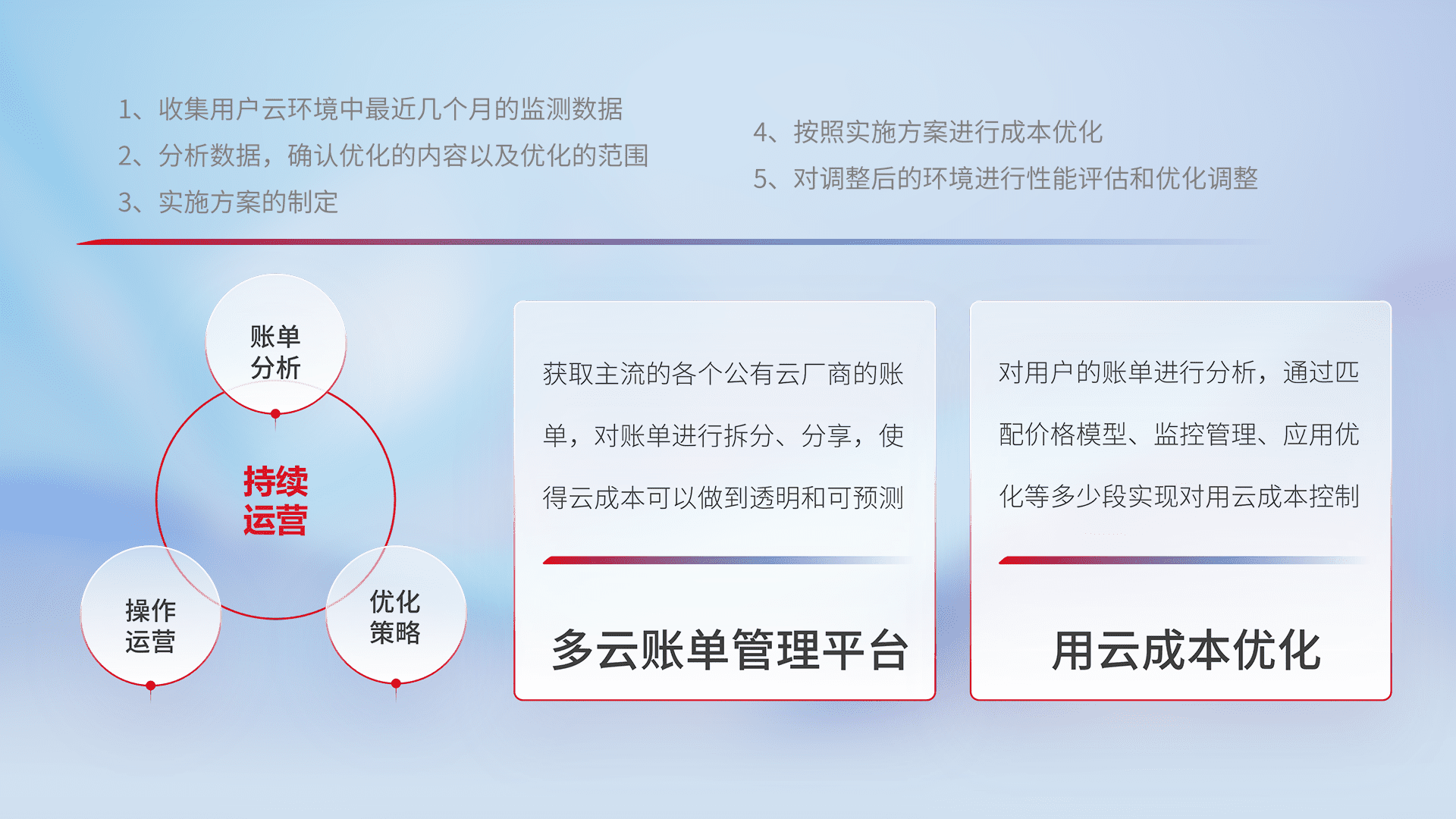 通过多云纳管,,,以统一的资源数据模型把客户的云资源进行抽象和封装,,,进而实现对多云资源的统一操作,,,保障云资源管理的可靠性、、、、稳定性与可用性。。量身定制化运维内容,,,,配置、、、、开发运维、、、补丁管理、、备份、、、监控、、、、认证和访问管理、、、、审计和日常巡检等,,保障在用云过程中的可靠度,,稳定度以及高可用率。。